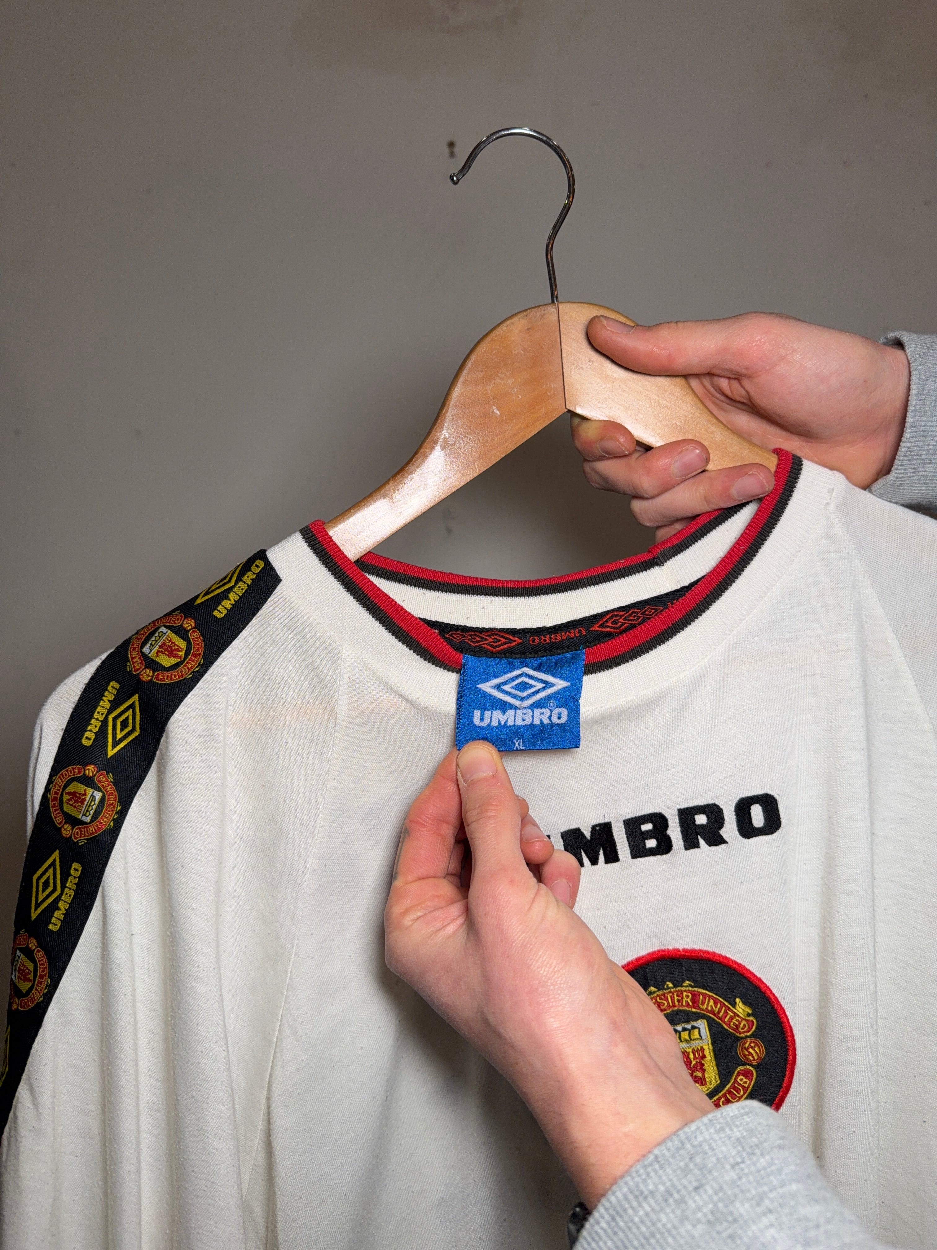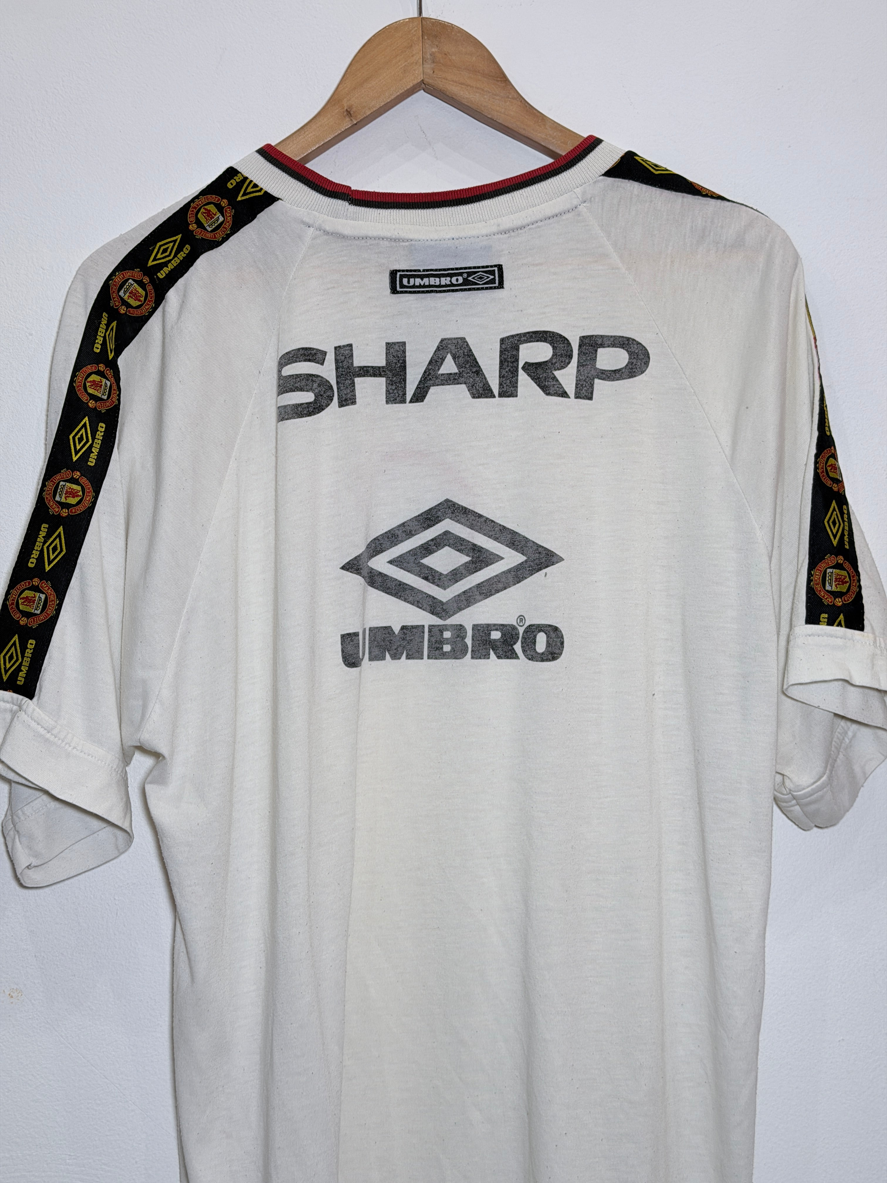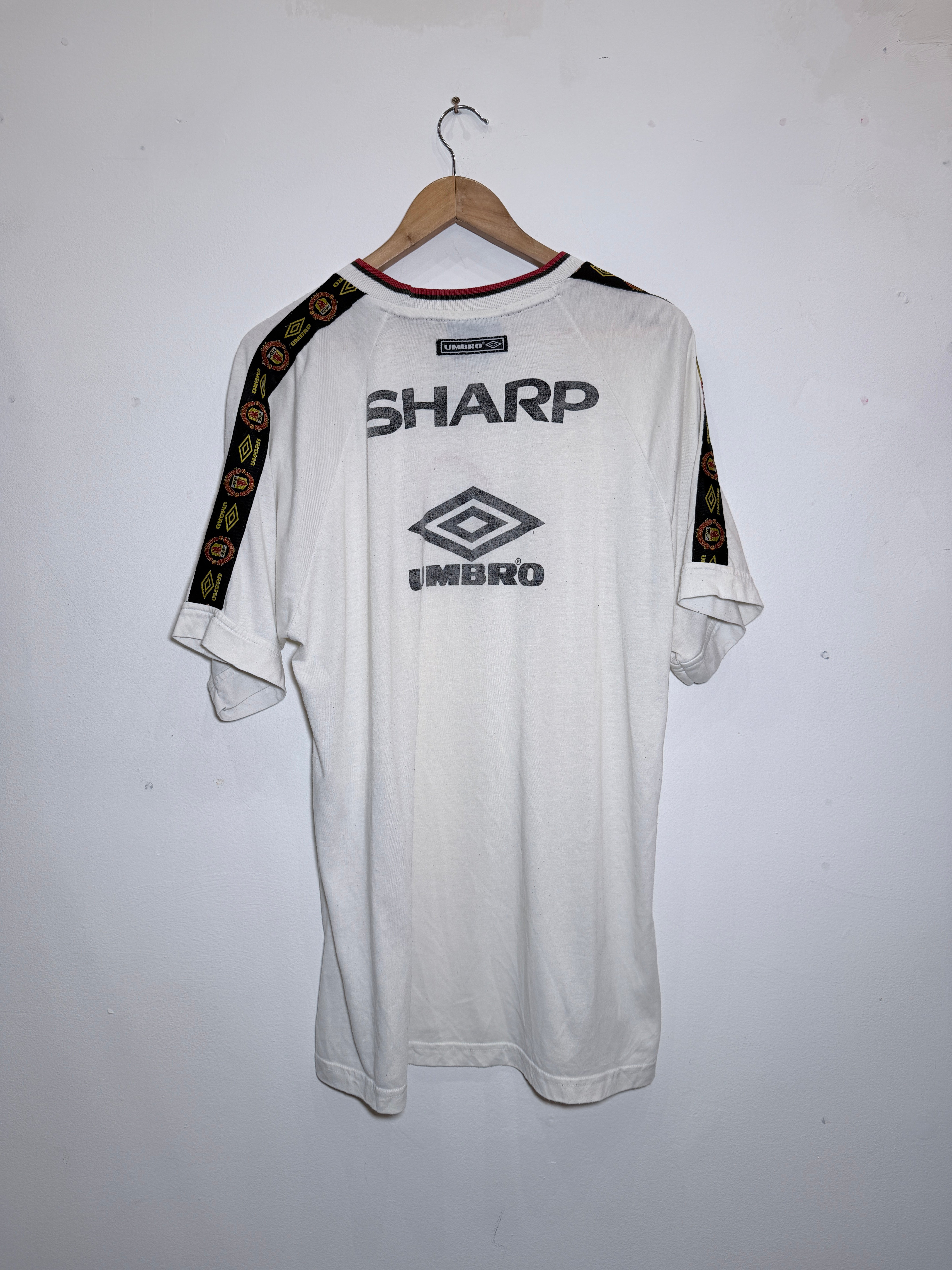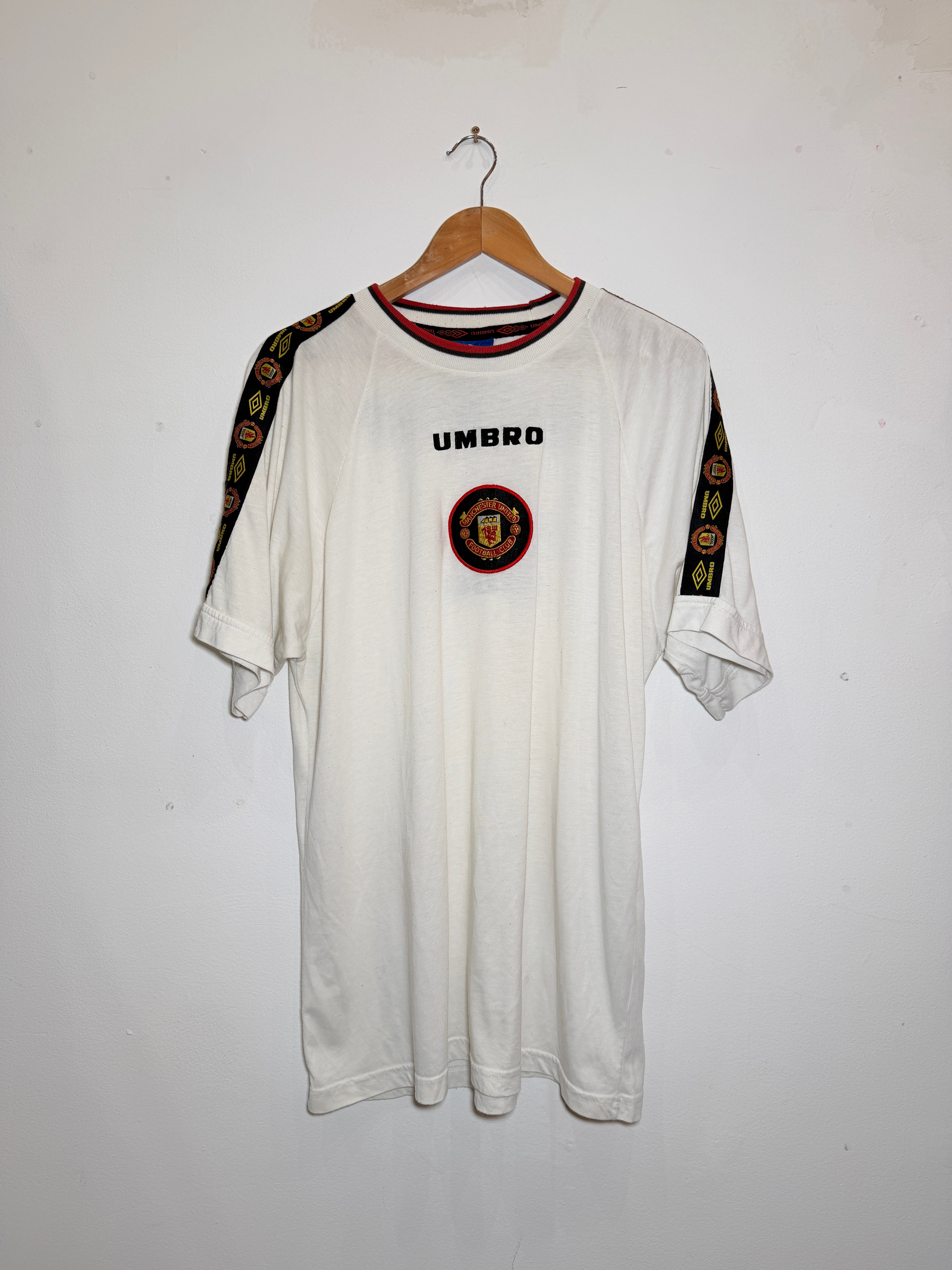Featuring a crisp white base, the shirt is detailed with classic Umbro sleeve taping and the central Manchester United crest. A must-have for collectors, this vintage kit perfectly captures the 90s aesthetic of Old Trafford.