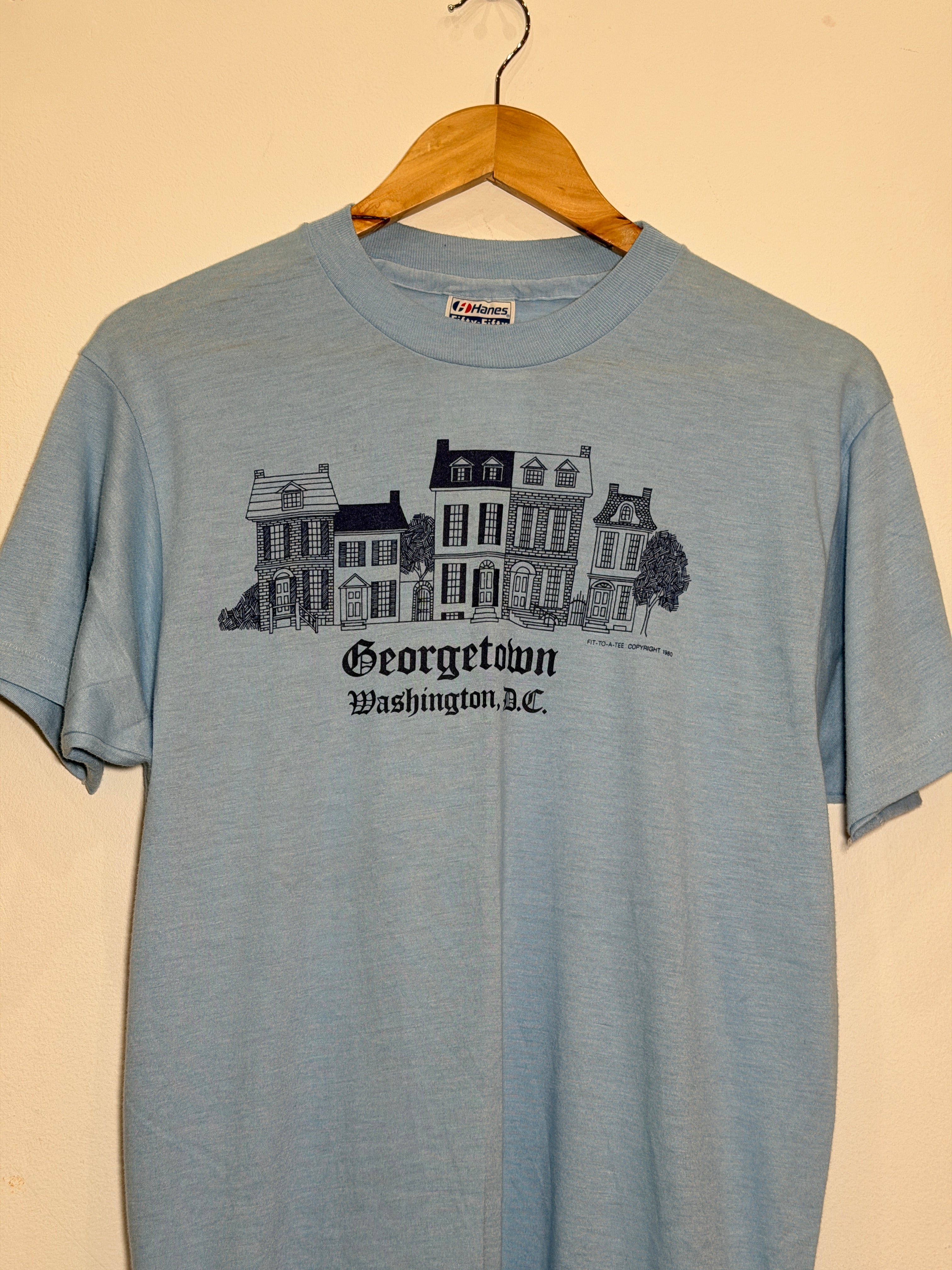 Step back in time with this classic 80's graphic tee, a perfect blend of nostalgia and comfort. Crafted from a durable 50/50 cotton-poly mix, it delivers that authentic vintage feel with modern wearability. The soft fabric resists shrinking and fading, keeping your retro style fresh wash after wash. Whether you're channeling throwback vibes or completing your vintage wardrobe, this tee is your ticket to effortless cool. Size M fits true to form for that perfect relaxed fit.